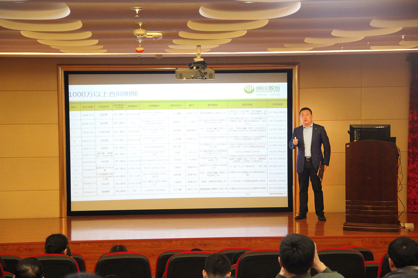 近日,纳川股份旗下子公司纳川管业在总部召开2019年销售大会,会议在管业总经理林艺辉主持下,纳川股份董事长助理傅义营等公司领导及全体销售人员参加了会议。会议回顾了2018年销售工作,肯定了工作中取得成绩,并总结了一年中的经验,分析差距与不足,同时明确2019年销售目标任务与举措。