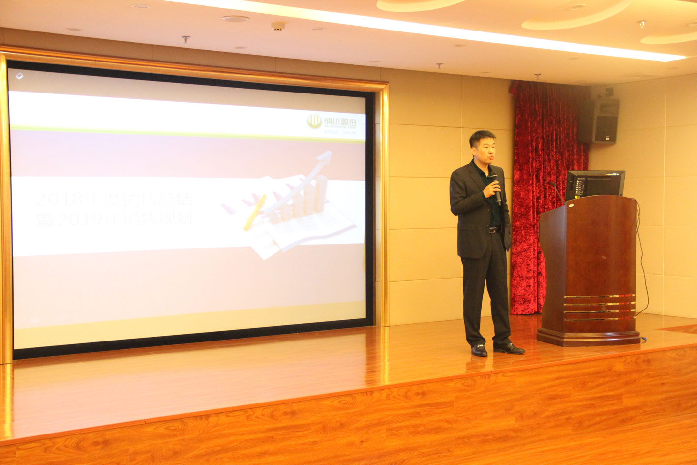纳川管业总经理林艺辉从2018年销售情况、未来趋势、业务要求三个方面作了讲解。并对全体销售人员的辛勤付出及全力支持表达了由衷感谢,对未来工作发展中心和方向做出要求。