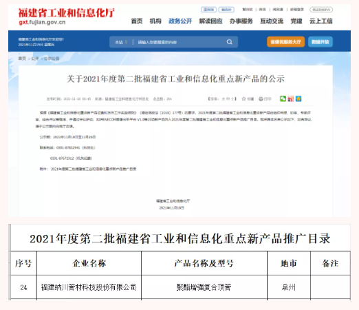 日前,福建省工业和信息化厅发布了《关于2021年度第二批福建省工业和信息化重点新产品的公示》,纳川股份“聚酯增强复合顶管”列入2021年度福建省工业和信息化重点新产品推广目录。