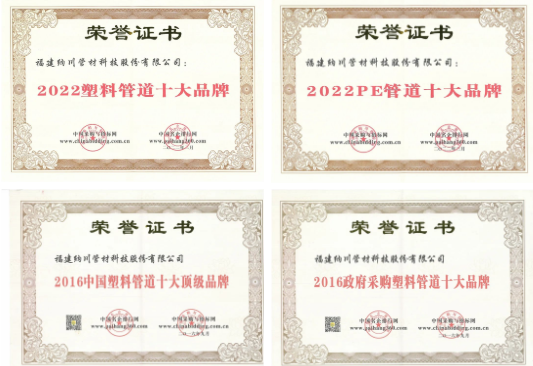 在长期发展过程中纳川股份获得了客户广泛认可,并被政府部门授予多项荣誉。2016年纳川作为海南文昌航天发射场主要的管材提供商,被授予“海南文昌航天发射场建设贡献奖”,同年,公司获评“政府采购塑料管道十大品牌”、“中国塑料管道十大顶级品牌”。2022年纳川股份再次荣获“2022PE管道十大品牌”、“2022塑料管道十大品牌”荣誉称号。