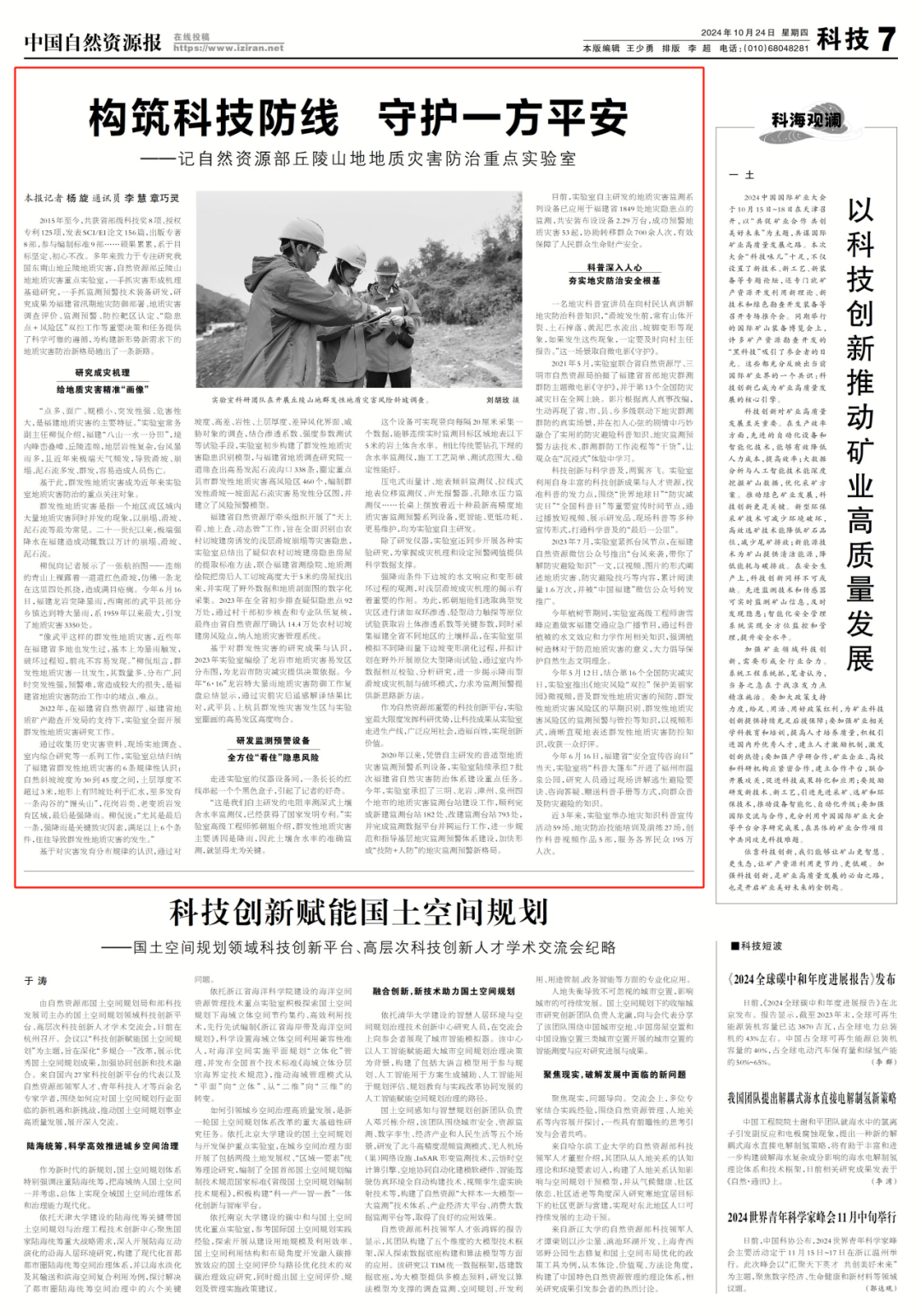 10月24日,中国自然资源报刊发通讯《构筑科技防线 守护一方平安——记自然资源部丘陵山地地质灾害防治重点实验室》,真实展现地质灾害防治新格局构建进程中,地灾防治重点实验室砥砺创新,支撑转化,义务科普,服务基层的工作写照。