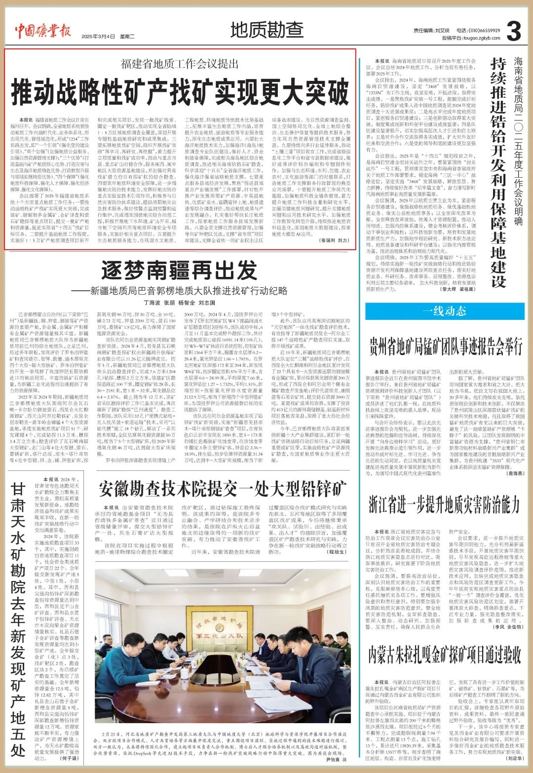 今天(3月4日)出版的中国矿业报刊发《福建省地质工作会议提出推动战略性矿产找矿实现更大突破》新闻,报道福建省地质工作会议召开。报道内容如下:福建省地质工作会议提出