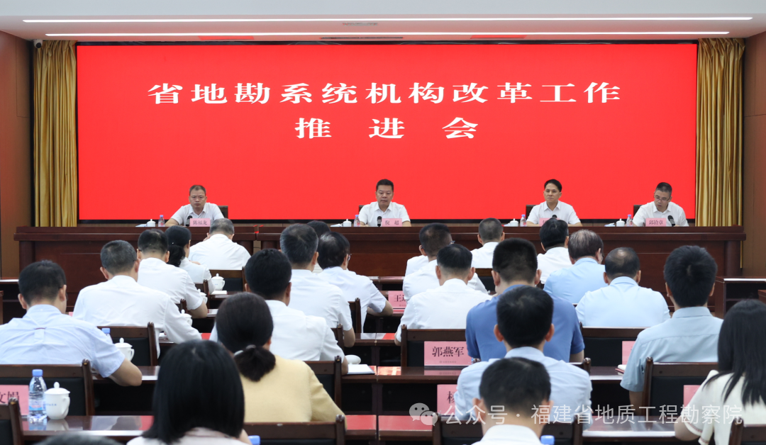 7月21日,福建省地勘系统机构改革工作推进会在福州召开。会议总结回顾机构改革进展和成效,部署推进下一阶段改革工作,强调要进一步统一思想、凝聚共识,明责尽责、攻坚克难,纵深推进改革、全力推动发展。省自然资源厅党组成员,省地质局党组书记、局长倪超讲话。省地质局党组成员、副局长,省地质科学研究院党委书记伍青云宣读拟组建企业集团和12家事业单位筹备组人员组成、职责任务。省地质局及省地质科学研究院领导共同为局、院所属12家事业单位揭牌。省地质局党组成员、副局长陈福龙出席会议,党组成员、副局长邱铃章主持会议。。