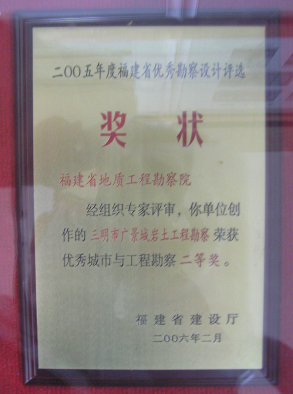 [2005]三明市广景城岩土工程勘察获优秀城市与工程勘察二等奖
