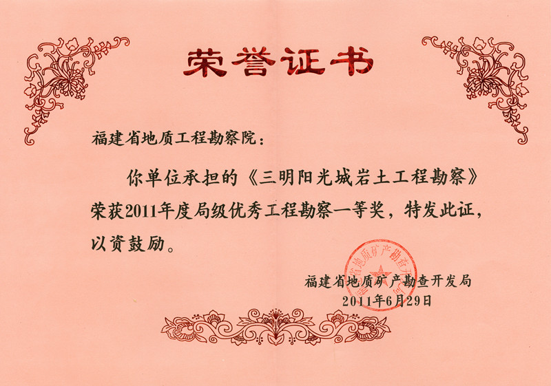 [2011]2011年三明阳光城岩土工程勘察局级优秀工程勘察一等奖_
