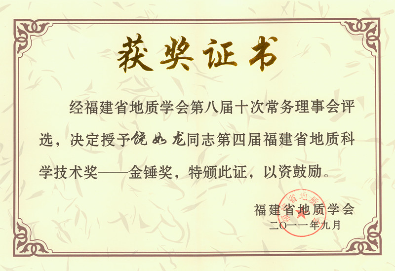 [2011]第四届福建省地质科学技术奖金锤奖(饶如龙)