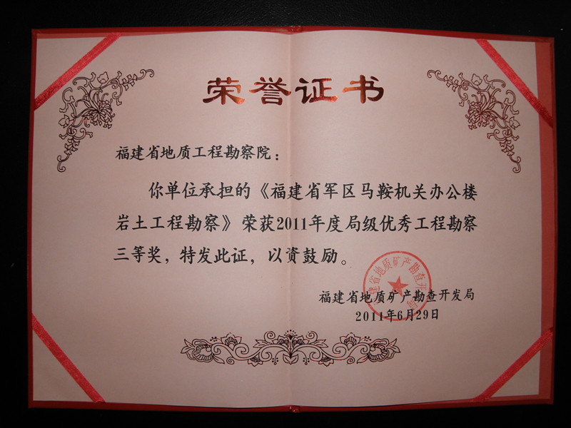 [2011]福建省军区马鞍机关办公楼局级优秀勘察三等奖_