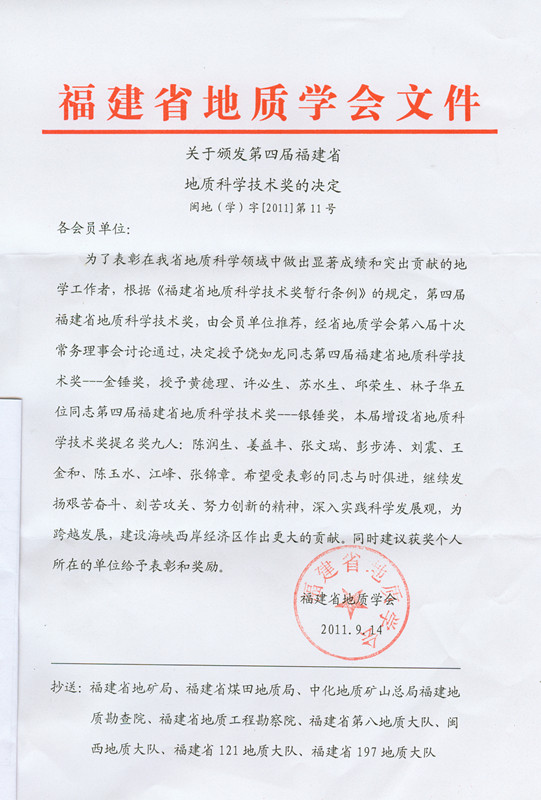 [2011]关于颁发第四届福建省地质科学技术奖的决定
