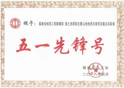 2015年11月11日-13日,福建省地矿局、省总工会、共青团省委联合举办“中国梦 劳动美”福建省地质职工地质灾害防治技术职业技能竞赛活动。国土资源部丘陵山地地质灾害防治重点实验室代表队在本次竞赛中夺得“团体第一名“佳绩。 经逐级推荐、严格审查,国土资源部丘陵山地地质灾害防治重点实验室成功入选福建省五一先锋号推荐候选名单,经公示后,正式被授予“五一先锋号”荣誉称号。