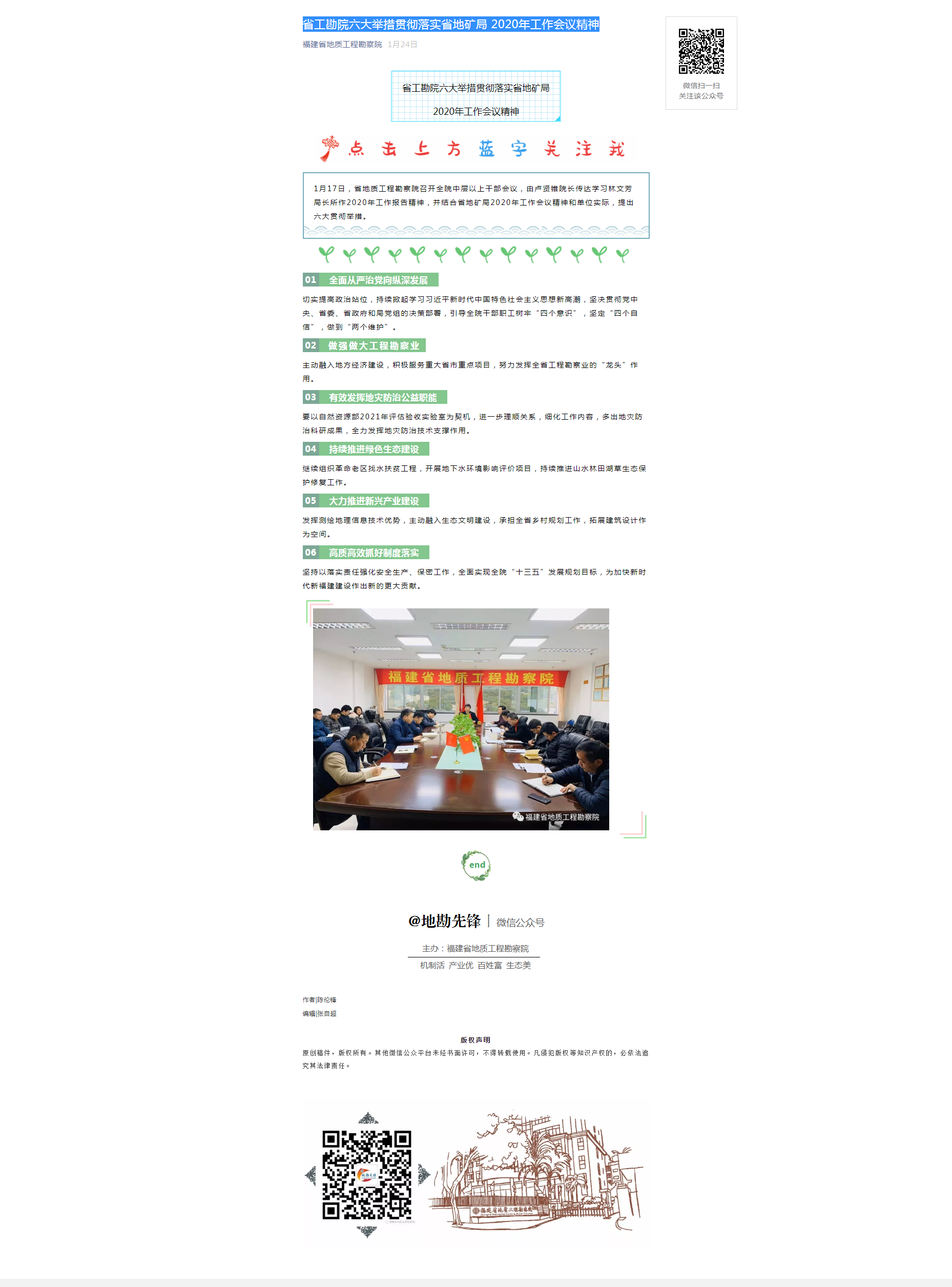 1月17日,省地质工程勘察院召开全院中层以上干部会议,由卢贤锥院长传达学习林文芳局长所作2020年工作报告精神,并结合省地矿局2020年工作会议精神和单位实际,提出六大贯彻举措。从严治党向纵深