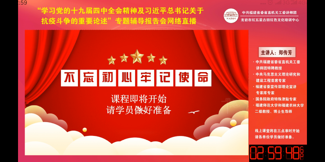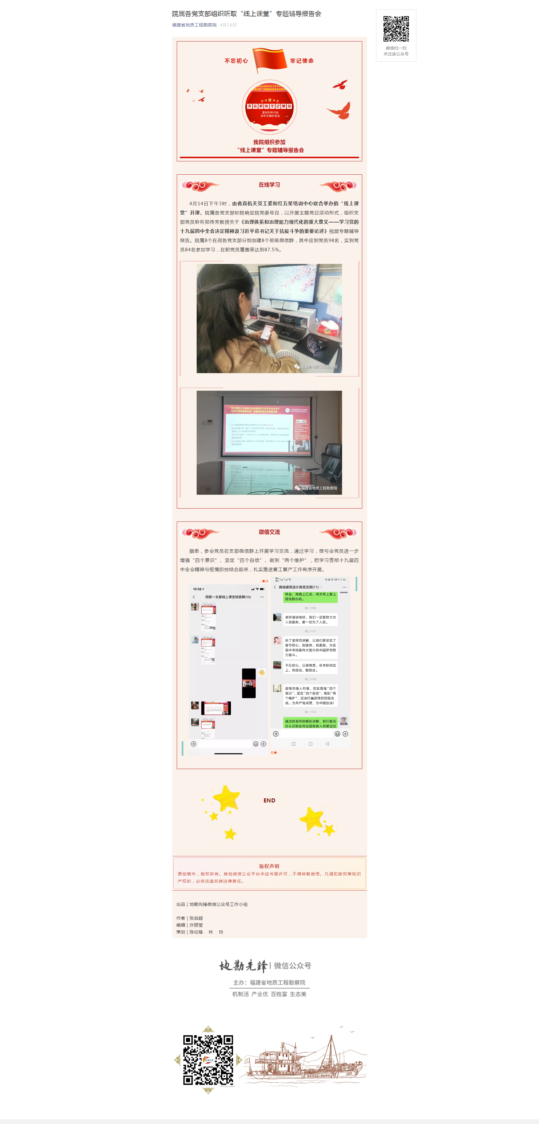 4月14日下午3时,由省直机关党工委和红五星培训中心联合举办的“线上课堂”开课。院属各党支部积极响应院党委号召,以开展主题党日活动形式,组织支部党员聆听郑传芳教授关于《治理体系和治理能力现代化的重大意义——学习党的十九届四中全会决定精神及习近平总书记关于抗疫斗争的重要论述》视频专题辅导报告。院属8个在岗各党支部分别创建8个班级微信群,其中应到党员98名,实到党员84名参加学习,在职党员覆盖率达到87.5%。