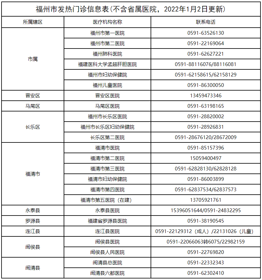 福州市发热门诊汇总表