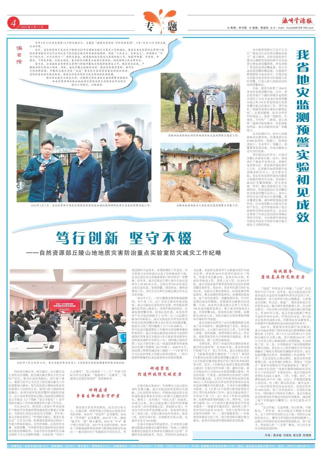 自然资源部丘陵山地地质灾害防治重点实验室以“科技防灾减灾,服务社会民众”宗旨为引领,积极服务我省地灾防治工作能力和体系建设。在全国防灾减灾日到来之际,海峡资源报对重点实验室近年来防灾减灾工作情况进行专题报道——《笃行创新 坚守不辍——自然资源部丘陵山地地质灾害防治重点实验室防灾减灾工作纪略》,并于5月11日发表于海峡资源报第四版。