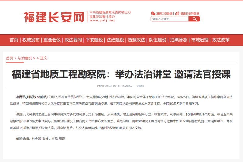 《福建法制报》日前刊发《悟空中文官网登录入口举办法治讲堂 邀请法官授课》新闻,报道福建省地矿局所属省地质工程勘察院举办法治讲堂,特邀福州市鼓楼区法院民事审判二庭法官作《民法典之建工合同中结算支付争议的司法认定》主题讲座,50余名干部职工参加学习。